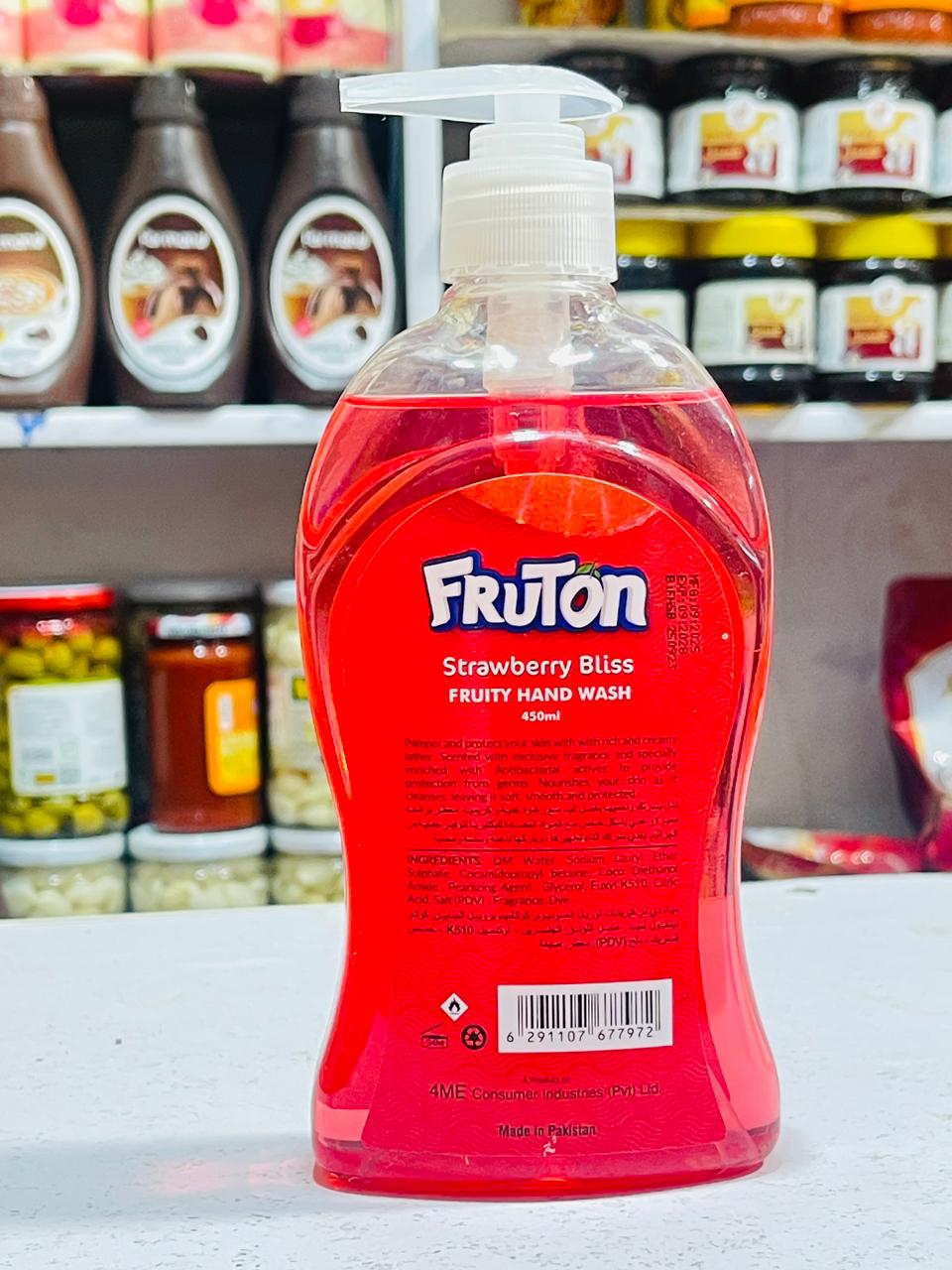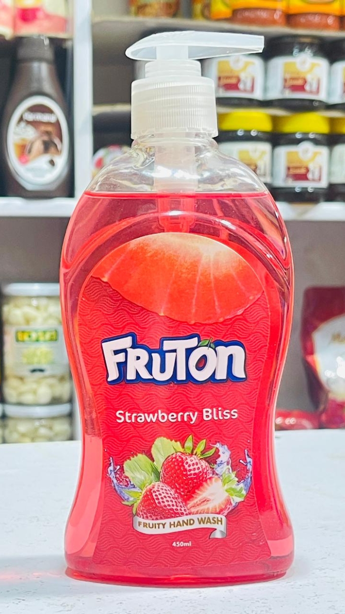 FruTon Strawberry Bliss Fruity Hand Wash, 450ml made in Pakistan. Premium liquid hand soap by 4ME Consumer Industries with refreshing strawberry fragrance for gentle, effective hand hygiene and moisturizing care.
